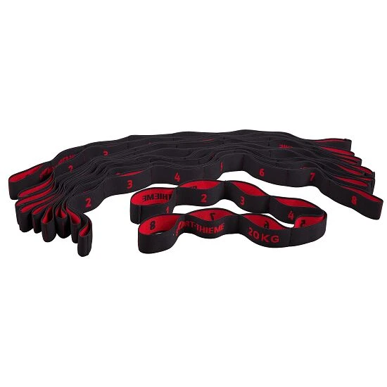 Das Sport-Thieme elastische Textilband-Set besteht aus dehnfähigem LatexGebräuchliche Bezeichnung für Gummi. Latex ist der Milchsaft des Kautschukbaums und ein Bestandteil von Gummi. Er wird nach dem Trocknen als Kautschuk bezeichnet. und Polyesterfäden. Aufgrund des Materials sind die Widerstandsbänder auch im Wasser optimal einsetzbar. Jedes Fitness-Band besitzt 8 Schlaufen, durch welche verschiedenste Griffpositionen eingenommen werden können. Zudem ermöglichen die besonders langen Schlaufen auch das Einsteigen mit den Füßen. Die Zugbänder sind in unterschiedlichen Stärken erhältlich, sodass der Trainierende sich bestens seinem Fitnessstand anpassen kann. Hierbei eignen sich die 7 kg-Bänder hervorragend für Kinder.
