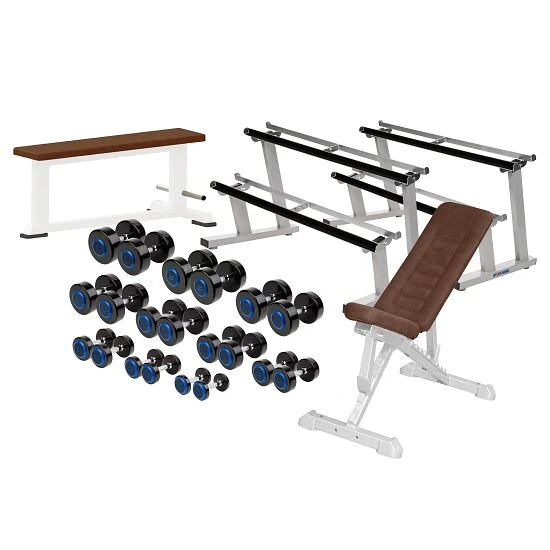 Die Flachbank „SQ“ mit Fußstütze aus Metall mit Kunstlederbezug sowie die Sport-Thieme Multifunktionsbank „SQ“ lassen sich vielseitig ins Training integrieren. Perfekt für multifunktionelle Kurzhanteltrainings oder Workouts mit dem eigenen Körpergewicht. Die beiden Sport-Thieme doppelten Hantel-Ablageständer bieten ausreichend Staumöglichkeiten für alle im Set enthaltenen Hanteln.